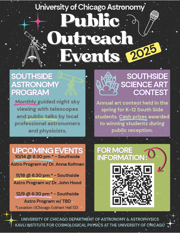 We invite all K-12 students living in the South Side of Chicago to participate in our annual Southside Art Contest. Winners get cash prizes, and all artists and their families are invited to a reception and award ceremony in Spring at the University of Chicago. Artwork must be submitted in person, please see the Art Contest webpage for more information: https://astrophysics.uchicago.edu/diversityinclusion/community-engagement-working-group/southside-astronomy-art-contest-2025-our-home-in-the-universe/ SUBMISSIONS CLOSED!